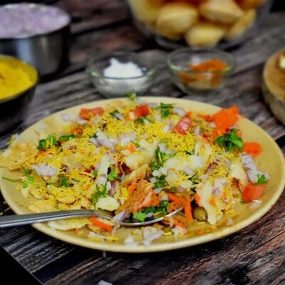 A classic Karnataka street snack made with crushed puris, spicy green peas curry.