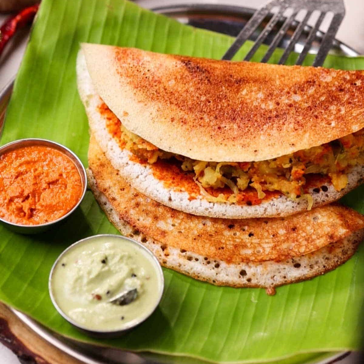 Very authentic, Crisp dosa layered with fiery red chutney, stuffed with soft potato masala — a signature delight rooted