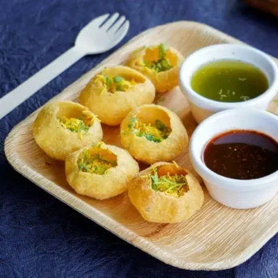 Crispy hollow puris filled with spicy potato mix and served with refreshing mint-flavoured