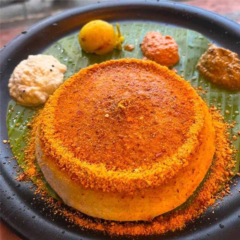 Fermented rice and lentils, steamed soft and plate-sized — Masala Thatte Idly with a touch of spice.